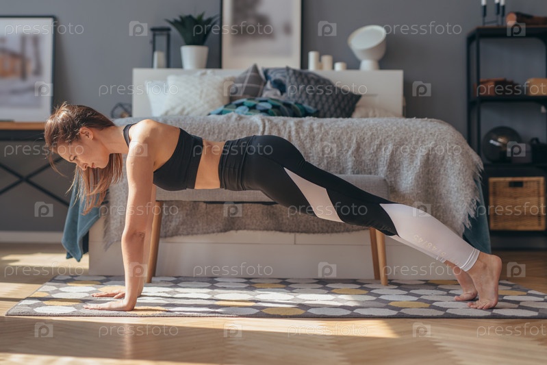 Полная планка. Фитнес-женщина тренируется дома