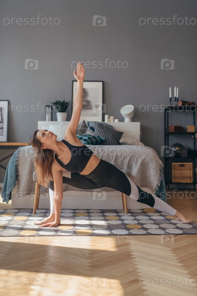 Тренируйтесь дома. Фитнес-женщина. Поза вытянутого бокового угла