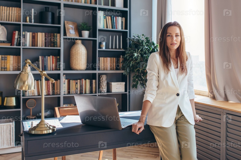 Портрет женщины возле рабочего места и смотрящей в камеру