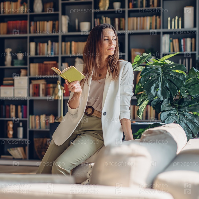 Женщина сидит дома с открытой книгой и задумчиво смотрит в сторону