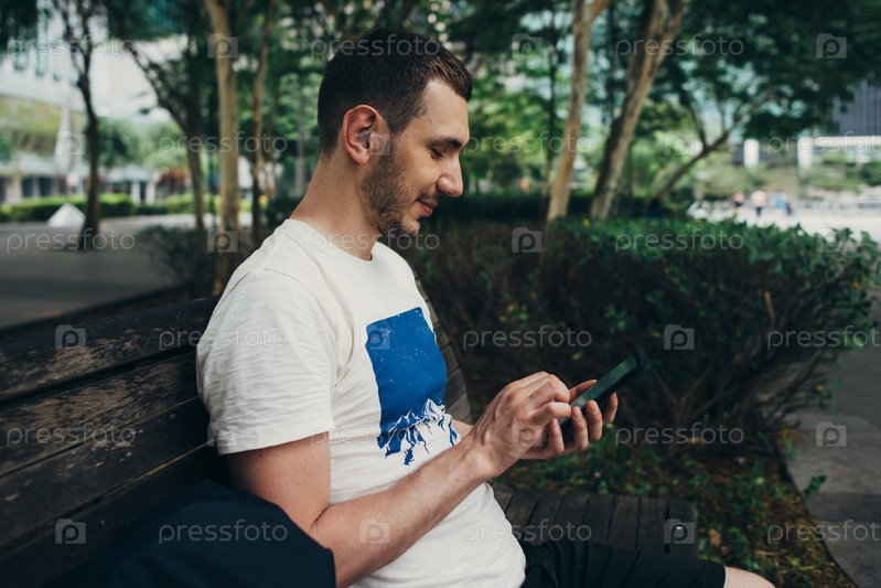 Мужчина сидит на скамейке в парке на открытом воздухе и пользуется смартфоном