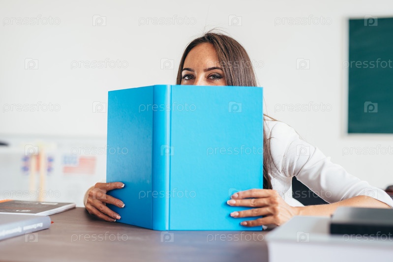 Молодая женщина сидит за столом и читает книгу