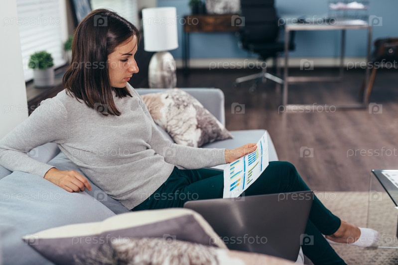 Деловая женщина держит документы, анализирует, готовит отчет о результатах работы