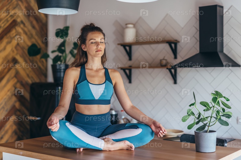 Спортивная женщина сидит на столе с закрытыми глазами и медитирует