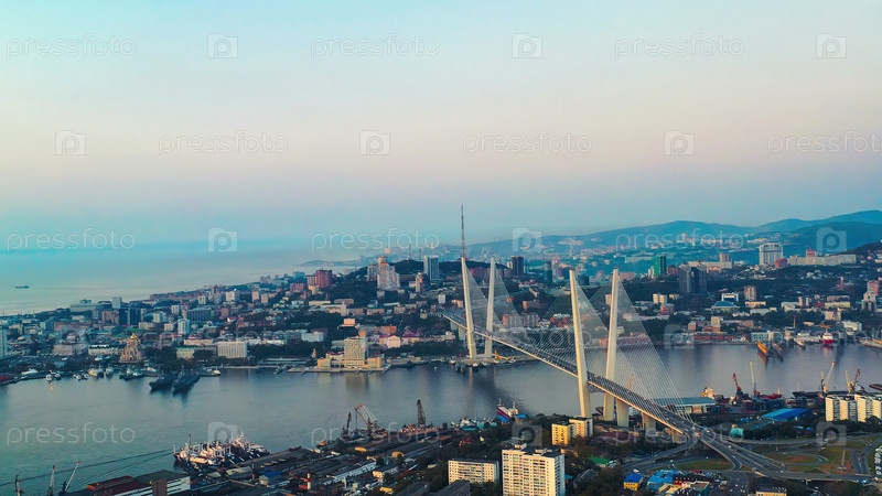 Вид сверху на городской пейзаж Владивостока и Золотой мост