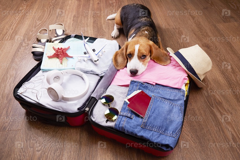 Собака-бигль лежит на открытом чемодане с одеждой и предметами для отдыха