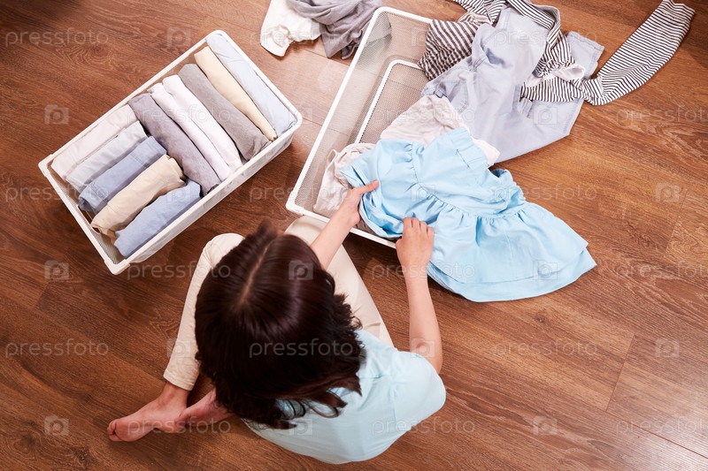 Женские руки аккуратно складывают одежду в металлическую корзину