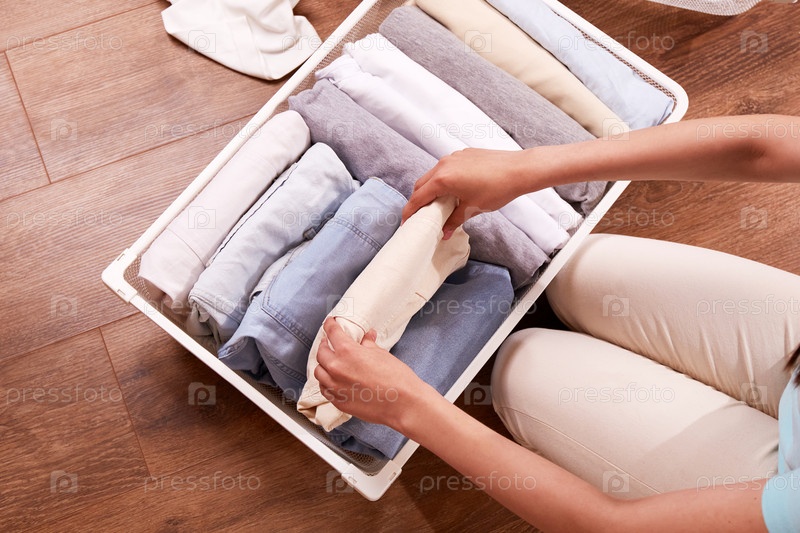 Женские руки аккуратно складывают одежду в металлическую корзину