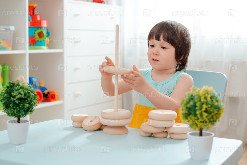 Маленькая девочка собирает деревянную неокрашенную пирамиду. Безопасные детские игрушки из натурального дерева