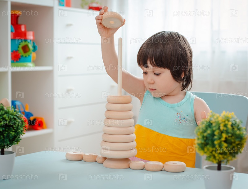 Маленькая девочка собирает деревянную неокрашенную пирамиду. Безопасные детские игрушки из натурального дерева