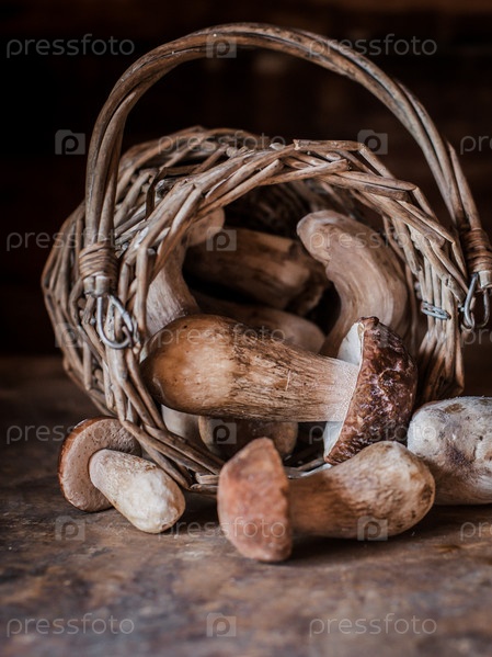 Белый гриб замороженный в корзине деревенский стиль темный деревянный стол