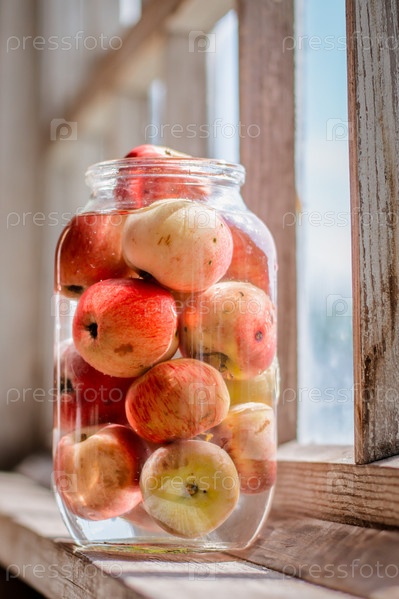 Свежий урожай спелых и здоровых фермерских яблок в стеклянной банке, в корзине
