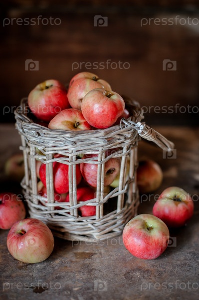 Свежий урожай спелых и здоровых фермерских яблок в стеклянной банке, в корзине. Натюрморт осенний деревенский у окна и старый комод на темном фоне