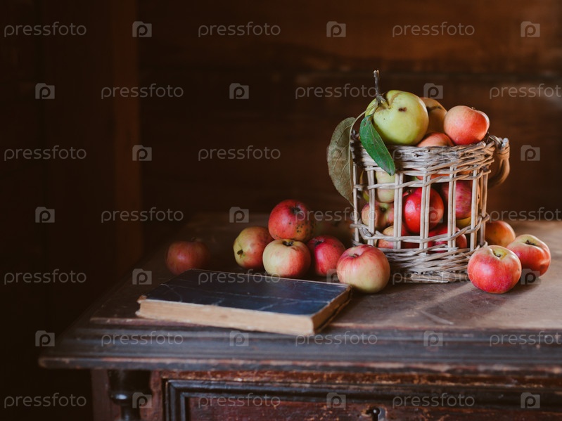 Свежий урожай спелых и здоровых фермерских яблок в стеклянной банке, в корзине