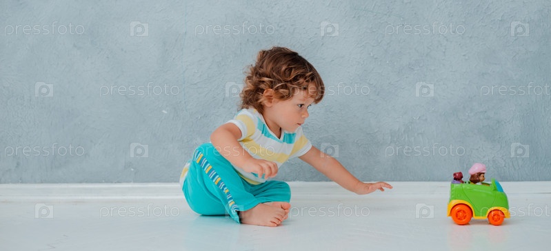 Забавный милый кудрявый малыш сидит, играя в машине на белом полу на фоне серой стены