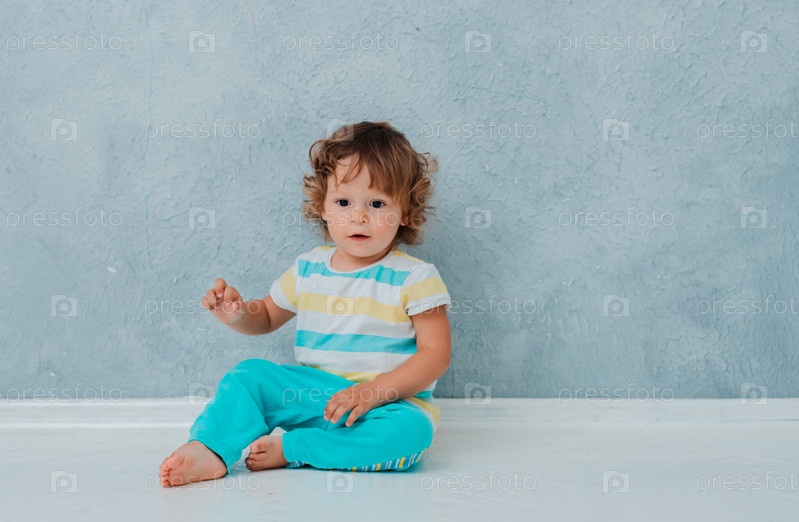 Забавный милый кудрявый малыш сидит, играя в машине на белом полу на фоне серой стены