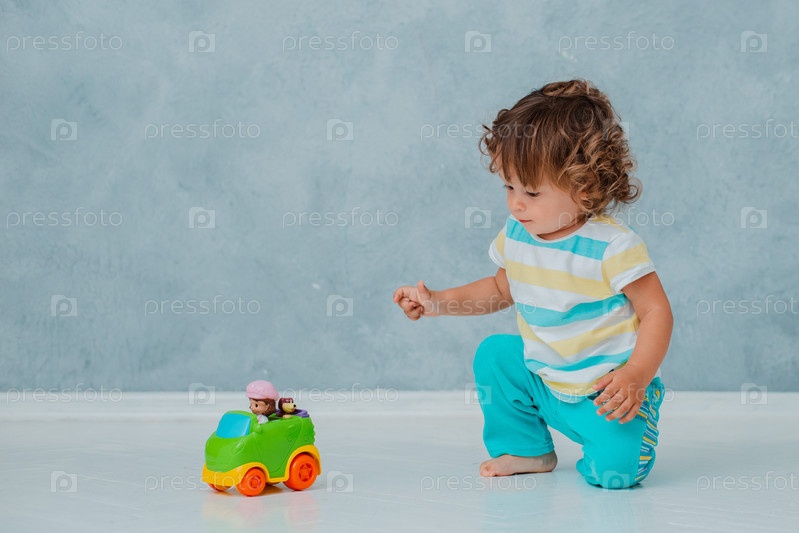 Забавный милый кудрявый малыш сидит, играя в машине на белом полу на фоне серой стены