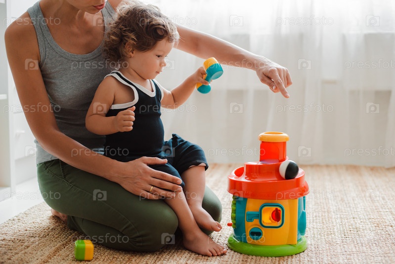 Мать и ребенок играют на полу в детской. Мама и маленький мальчик делают с пластиковыми разноцветными игрушками