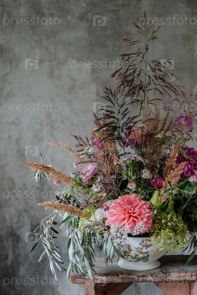 Большая цветочная композиция букет на рабочем столе флориста на фоне бетонной стены