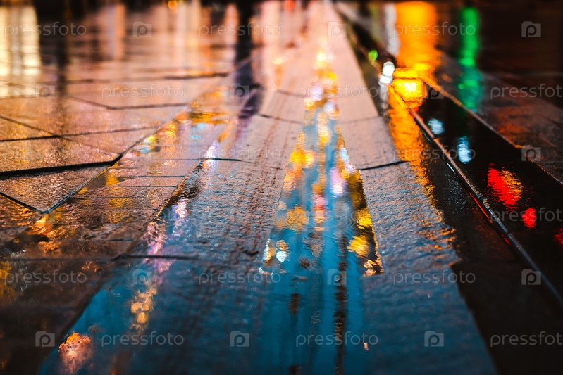 Дождливая ночь в большом городе, отблески огней на мокрой поверхности дороги. Вид с уровня улицы. абстрактный фон