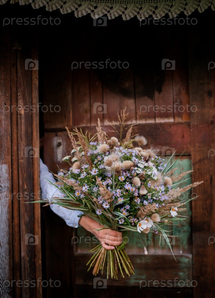 Осенний букет полевых цветов в руках хипстерской флористки