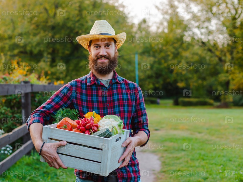Молодой человек 30-35 лет, фермер, шляпная коробка, свежие экологические овощи, садовый закат. вегетарианство, здоровое питание, осенний урожай, фермерство, без нитратов, образ жизни, аутентичный, зеленый образ жизни, домашнее выращивание