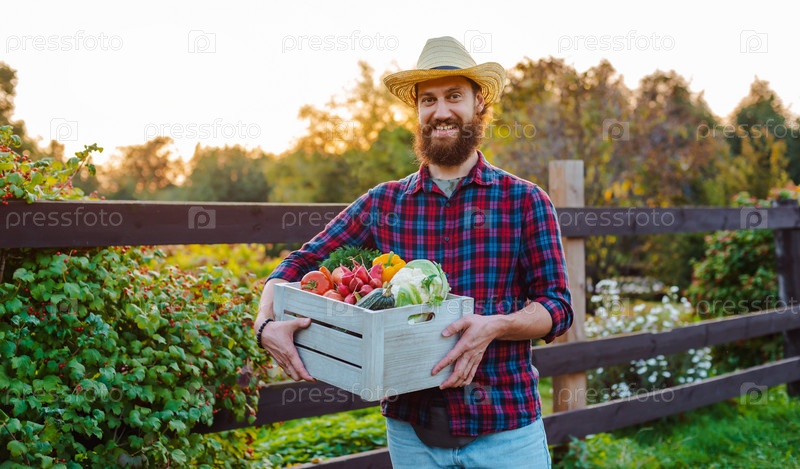 Молодой человек 30-35 лет, фермер, шляпная коробка, свежие экологические овощи, садовый закат. вегетарианство, здоровое питание, осенний урожай, фермерство, без нитратов, образ жизни, аутентичный, зеленый образ жизни, домашнее выращивание