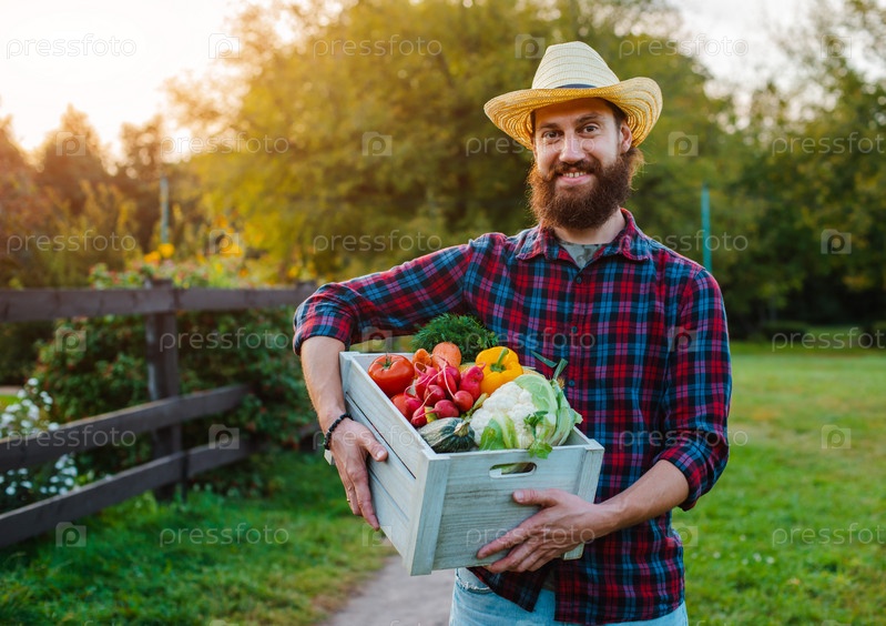 Молодой человек 30-35 лет, фермер, шляпная коробка, свежие экологические овощи, садовый закат. вегетарианство, здоровое питание, осенний урожай, фермерство, без нитратов, образ жизни, аутентичный, зеленый образ жизни, домашнее выращивание