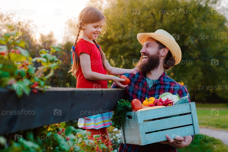 Дети маленькая девочка держит отца корзину свежих органических овощей с домашним садом