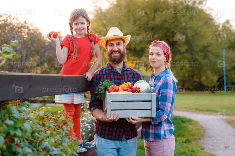 Дети маленькая девочка держит отца корзину свежих органических овощей с домашним садом