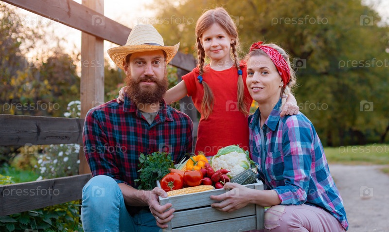 Семья фермеров со свежими овощами в коробке