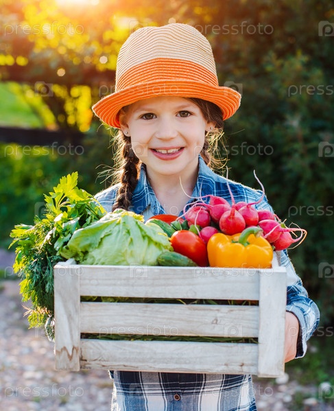 Дети маленькая девочка держит корзину свежих органических овощей на фоне домашнего сада на закате. Здоровый семейный образ жизни. Время сбора урожая осенью. Ребенок фермер