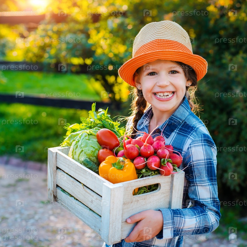 Дети маленькая девочка держит корзину свежих органических овощей на фоне домашнего сада на закате. Здоровый семейный образ жизни. Время сбора урожая осенью. Ребенок фермер