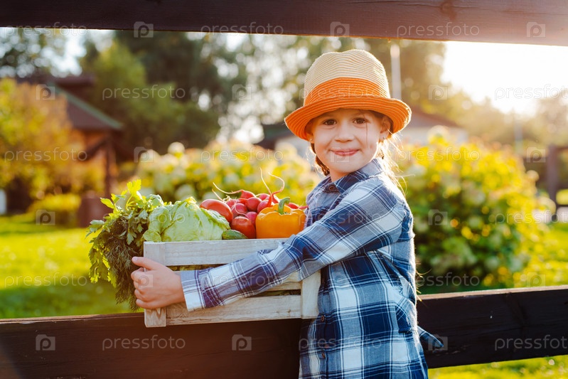 Дети маленькая девочка держит корзину свежих органических овощей на фоне домашнего сада на закате. Здоровый семейный образ жизни. Время сбора урожая осенью. Ребенок фермер