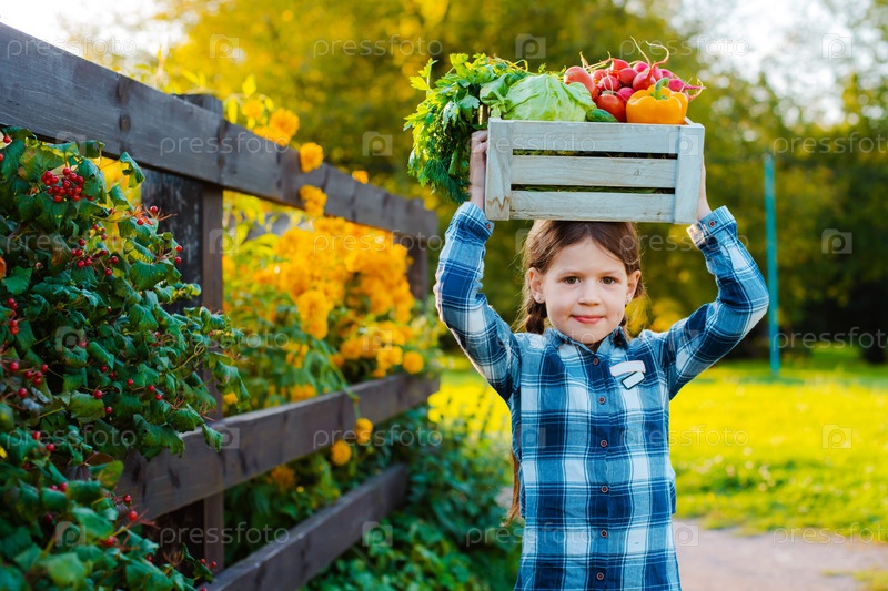Дети маленькая девочка держит корзину свежих органических овощей на фоне домашнего сада на закате. Здоровый семейный образ жизни. Время сбора урожая осенью. Ребенок фермер