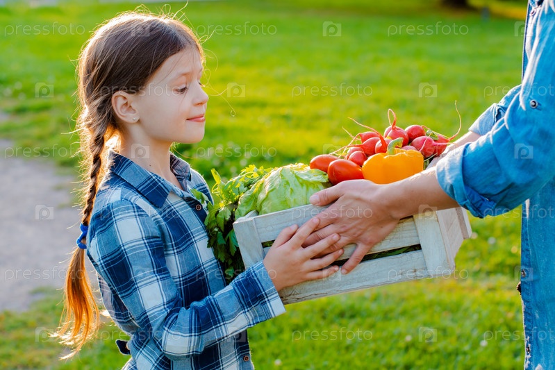 Дети маленькая девочка держит маму корзину свежих органических овощей с домашним садом