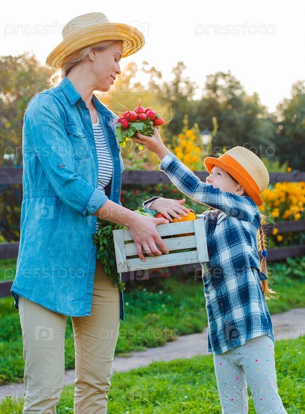 Дети, маленькая девочка, дочь держит с матерью корзину со свежими органическими овощами в домашнем саду. Здоровый семейный образ жизни, забота. Время сбора урожая осень. семейные фермеры. Вегетарианская, сырая пища. редька