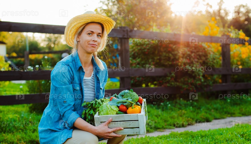 Молодая красивая женщина 30-35 лет в шляпе с коробкой свежих экологических овощей на фоне сада на закате