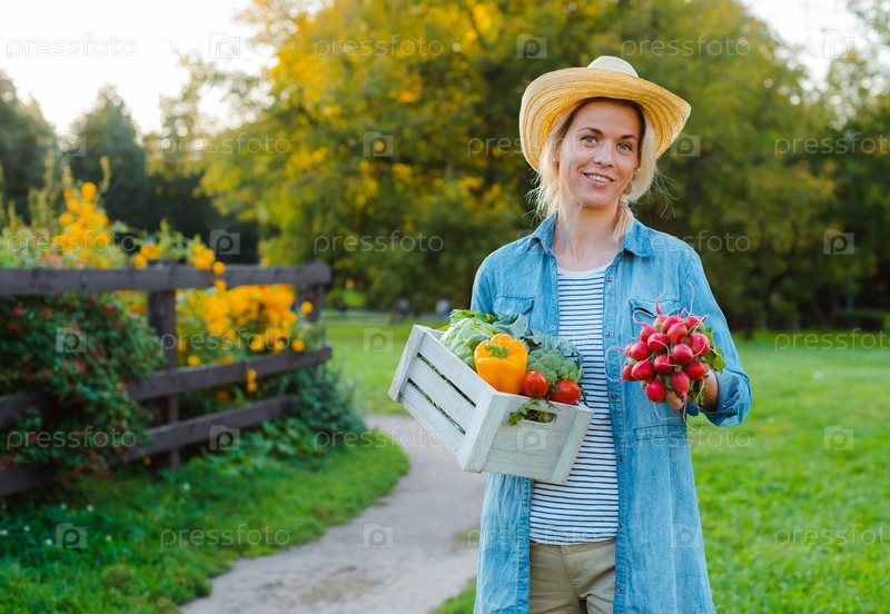 Молодая красивая женщина 30-35 лет в шляпе с коробкой свежих экологических овощей на фоне сада на закате