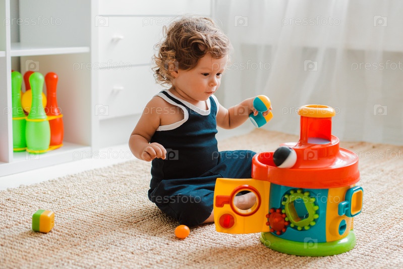 Ребенок играет на полу в комнате в развивающие пластиковые игрушки