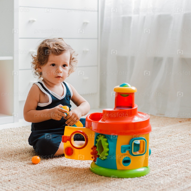 Ребенок играет на полу в комнате в развивающие пластиковые игрушки