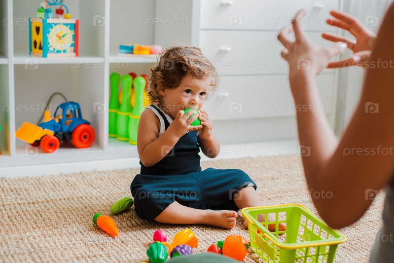 Мать и ребенок играют на полу в детской. Мама и маленький мальчик делают с пластиковыми разноцветными игрушками