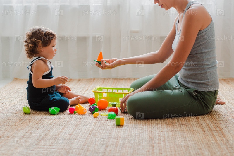 Мать и ребенок играют на полу в детской. Мама и маленький мальчик делают с пластиковыми разноцветными игрушками