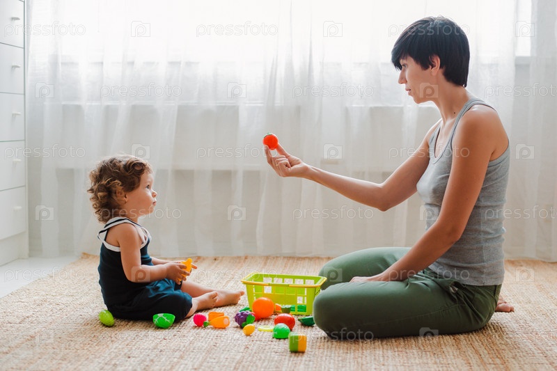 Мать и ребенок играют на полу в детской. Мама и маленький мальчик делают с пластиковыми разноцветными игрушками