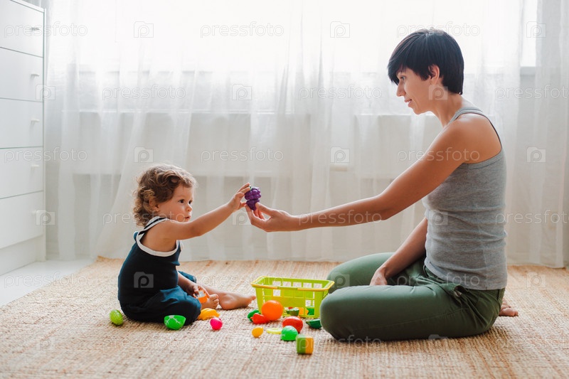 Мать и ребенок играют на полу в детской. Мама и маленький мальчик делают с пластиковыми разноцветными игрушками