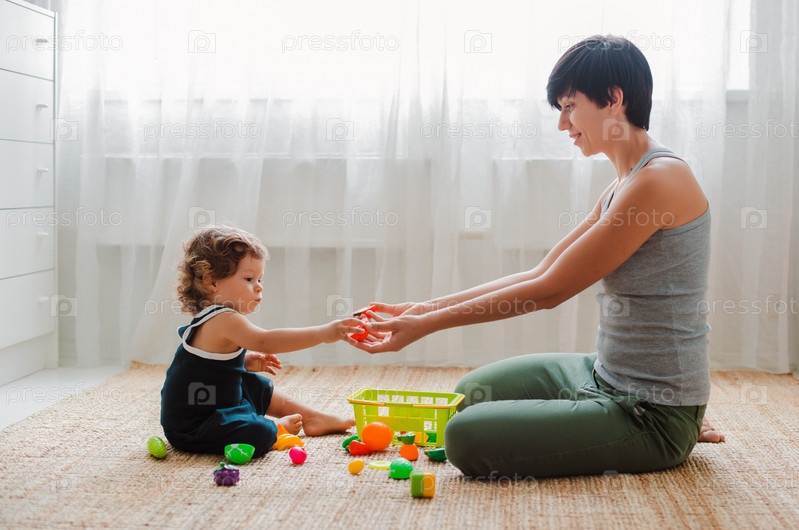 Мать и ребенок играют на полу в детской. Мама и маленький мальчик делают с пластиковыми разноцветными игрушками