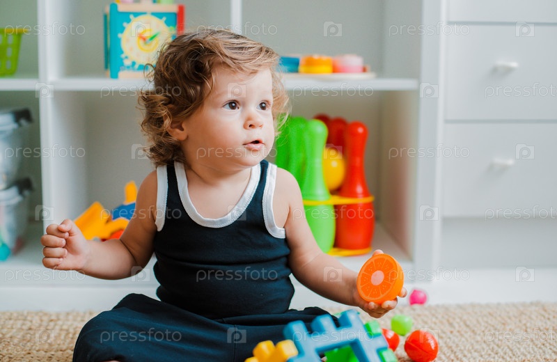 Ребенок играет на полу в комнате в развивающие пластиковые игрушки