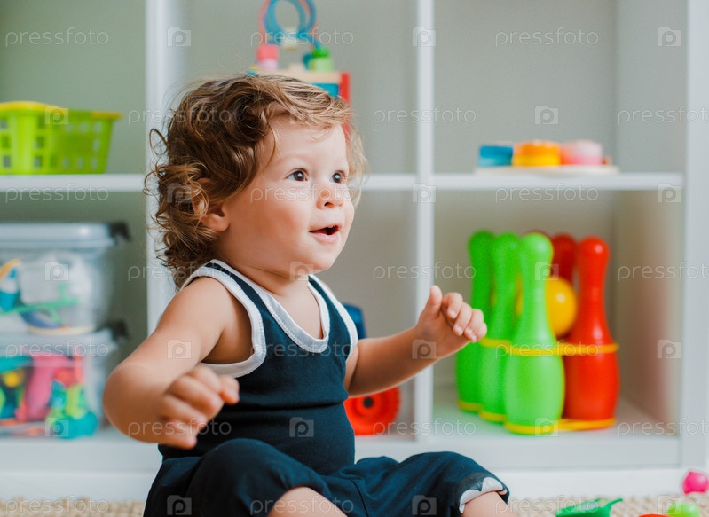 Ребенок играет на полу в комнате в развивающие пластиковые игрушки