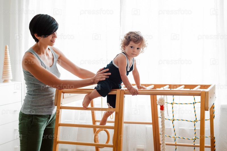 Ребенок в раннем возрасте 1,5 лет занимается в домашнем детском деревянном спортивном комплексе