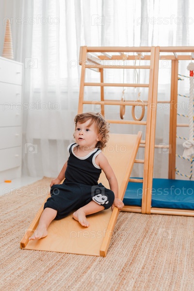 Ребенок в раннем возрасте 1,5 лет занимается в домашнем детском деревянном спортивном комплексе